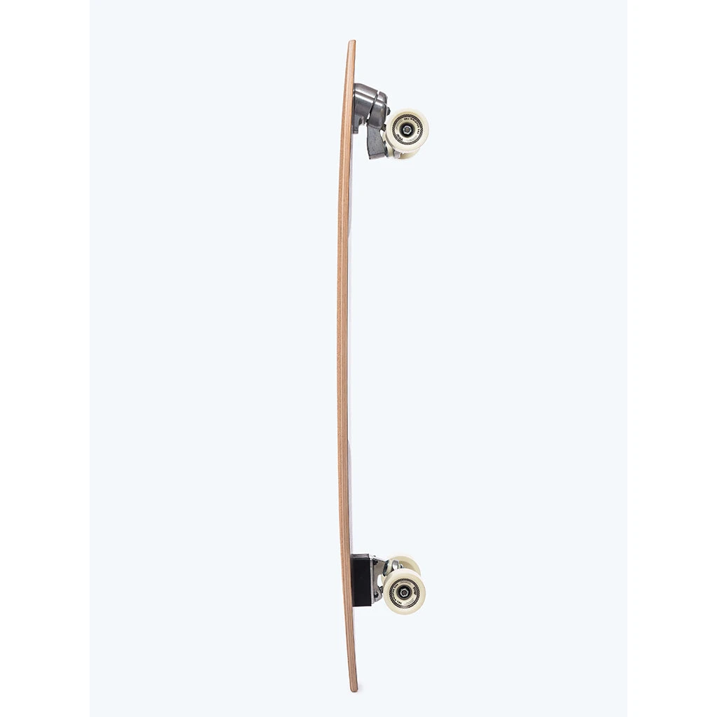 It practices cross-stepping, nose riding and the wide turns typical of classic surfing thanks to its large deck and long wheelbase (27โณ). Molded with a low concave and built using a cork top so you can skate barefoot feeling a real โretro feelingโ. Mounted with the Meraki system (S5) and Ura 66x51mm 78A wheels, ideal for skating on most terrains.