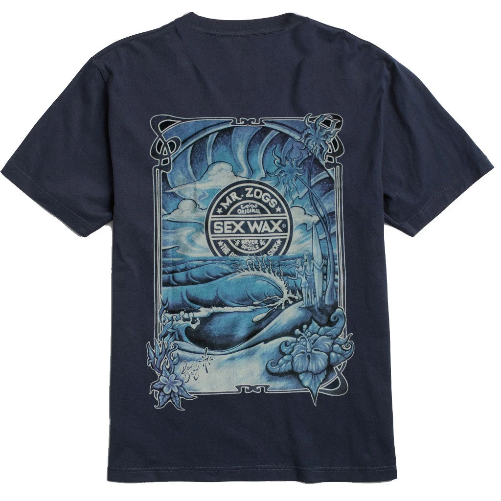 A classic retro surf scene from Drew Brophy in shades of blue with Sexwax appearing as the rising sun. This art is akin to some of the best t-shirt graphics from the 60’s and 70’s. Single color Sexwax logo printed on front left chest with Drew’s masterpiece on the back. Loose fit 6 oz. 100% Cotton T-Shirt.