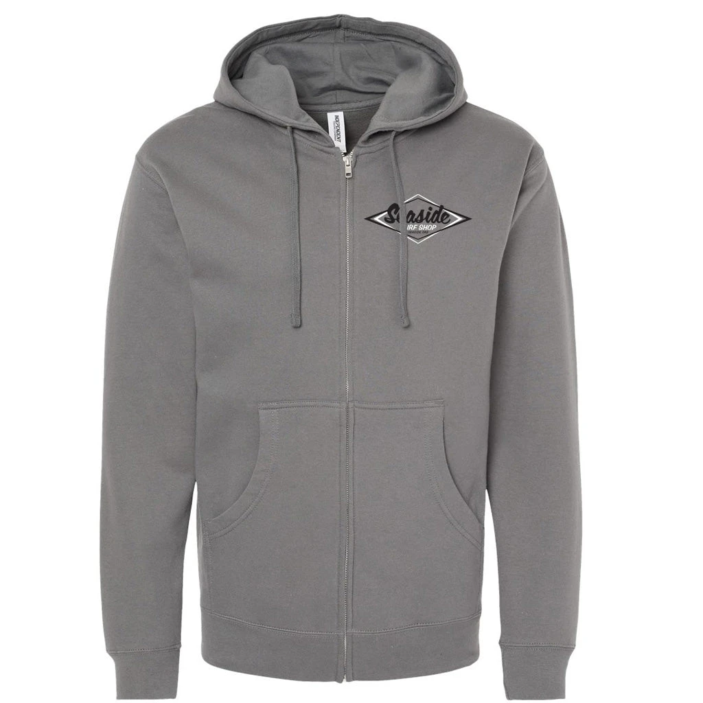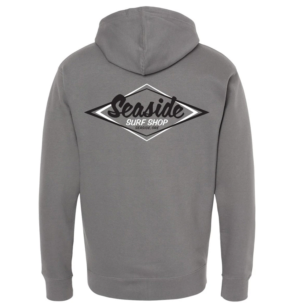 A classic-style Seaside Surf Shop logo on a cozy soft hooded sweatshirt with a zipper.Β
